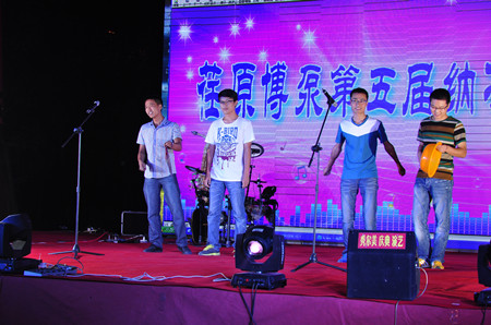 18:00,文藝演出正式開始,首先是搖滾樂隊(duì)帶來的勁爆歌曲,將晚會現(xiàn)場帶入了熱烈的氛圍。晚會上,有抒情懷舊的經(jīng)典老歌,有驚艷柔美的女工舞蹈,有激情四射的魅力街舞,還有新員工自編自演的三句半,更有抒發(fā)對公司深厚情感的詩朗誦《騰飛吧,荏原博泵》。有公司領(lǐng)導(dǎo)的獻(xiàn)唱,有普通員工的表演。每一個節(jié)目,都凝聚了員工的心聲,每一個節(jié)目都飽含了員工的熱情。在晚會上,公司常務(wù)副總經(jīng)理王正軍先生深情地說;今天是個歡樂的日子,荏原博泵歷經(jīng)八年的發(fā)展,從現(xiàn)在開始已經(jīng)步入了健康發(fā)展的軌道。今年公司訂單已達(dá)五個億,下一步就是生產(chǎn)、制造、交貨要交給在座各位,希望大家就像一臺機(jī)器的每個部件一樣,齊心協(xié)力配合好,公司的經(jīng)營成果會與大家共享!王總也一改往日的豪情,演繹了一首《風(fēng)往北吹》,表現(xiàn)了一個鐵血男兒柔情的一面。
